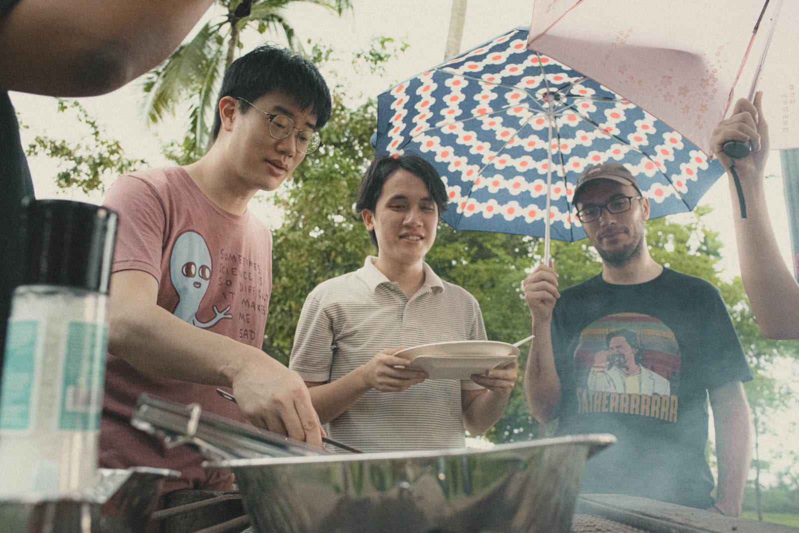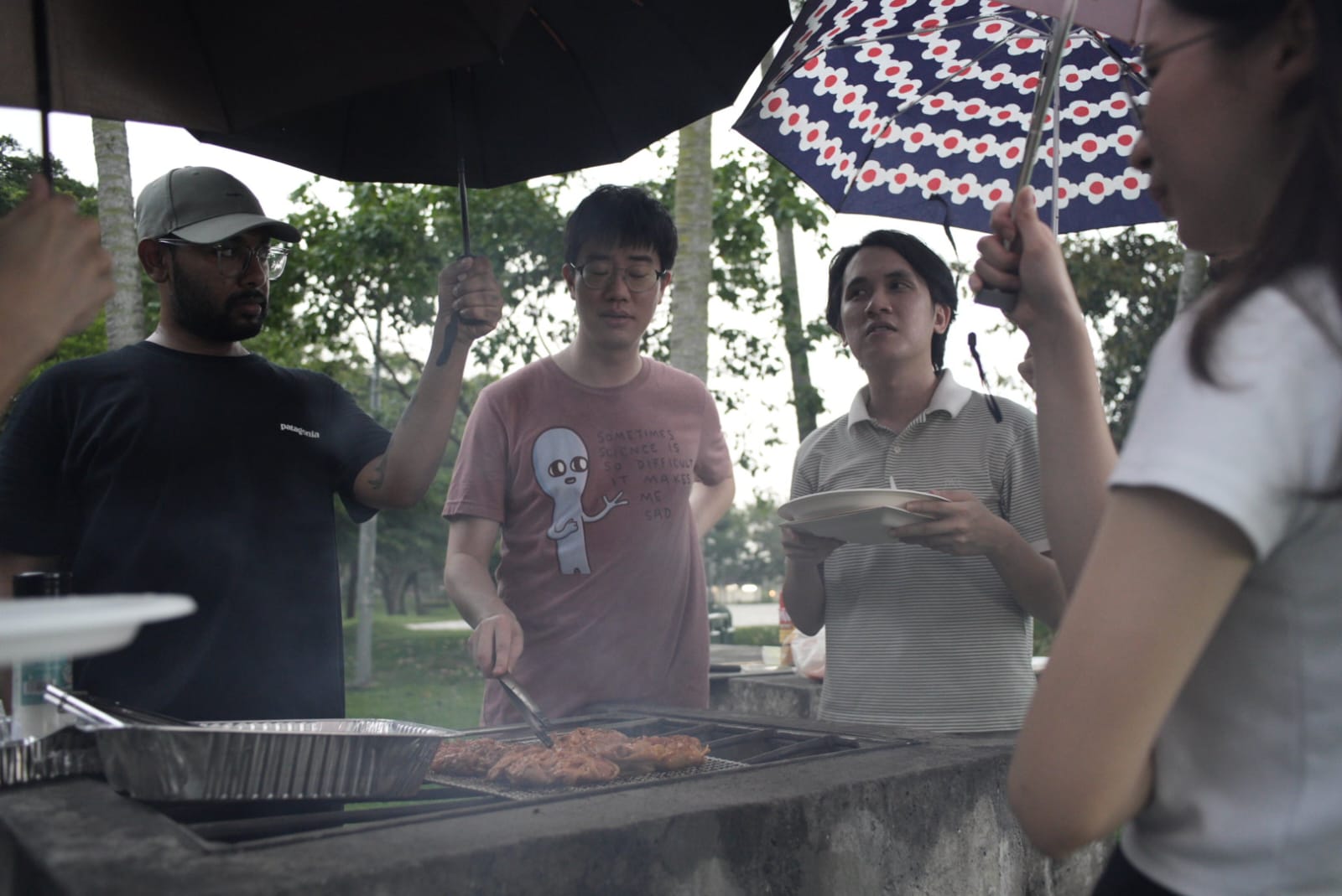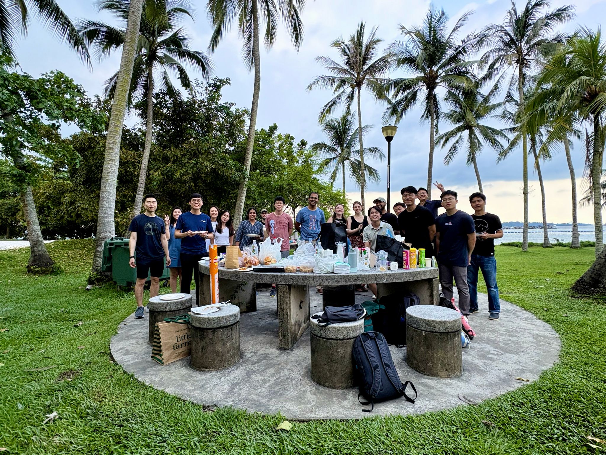 The Nagarajan lab looking happy, excited for food, and, for a brief moment, dry